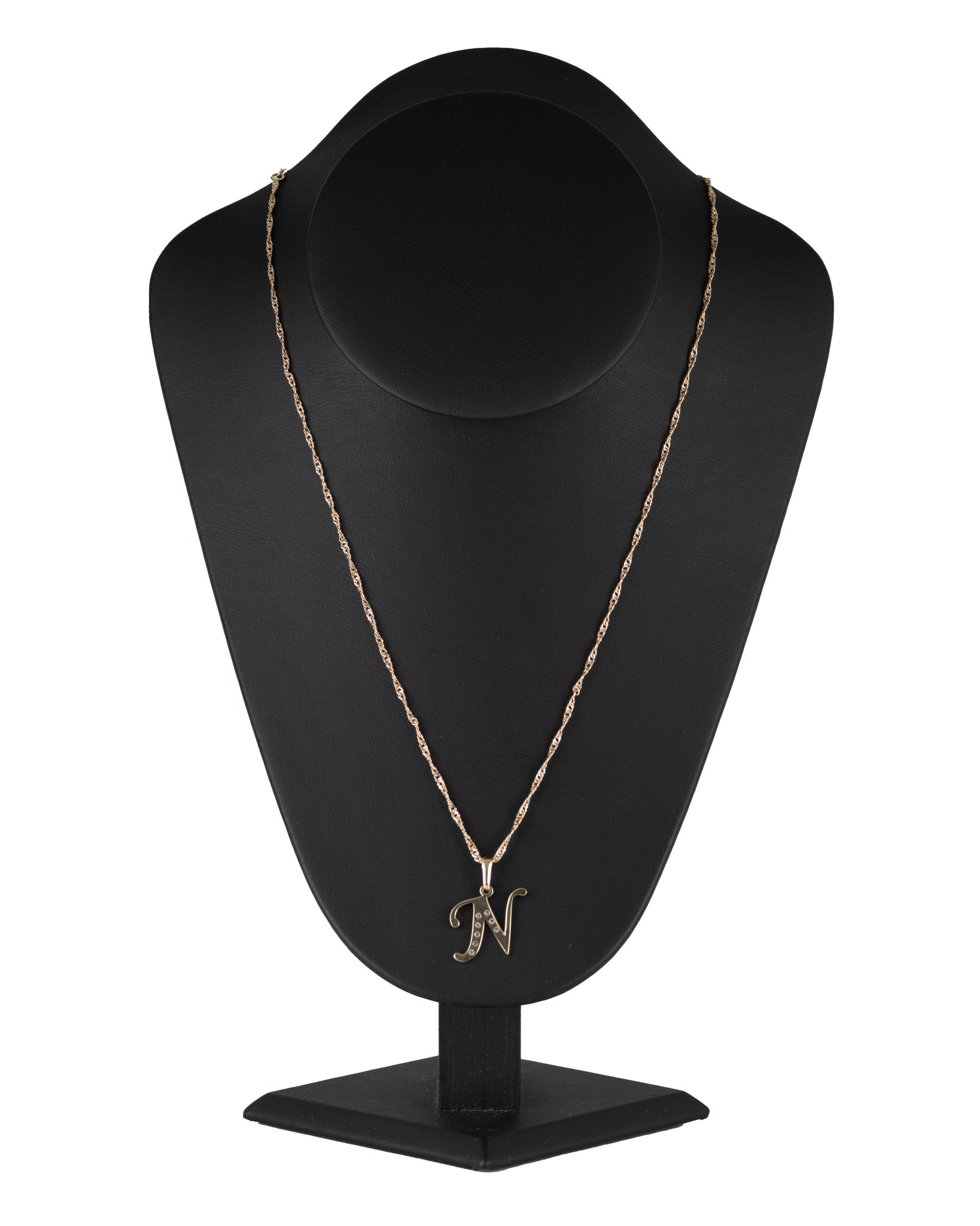 Dije inicial en Oro de 10 kilates con circonitas, 2cm ó 2.5cm de largo incluyendo la rehaza.