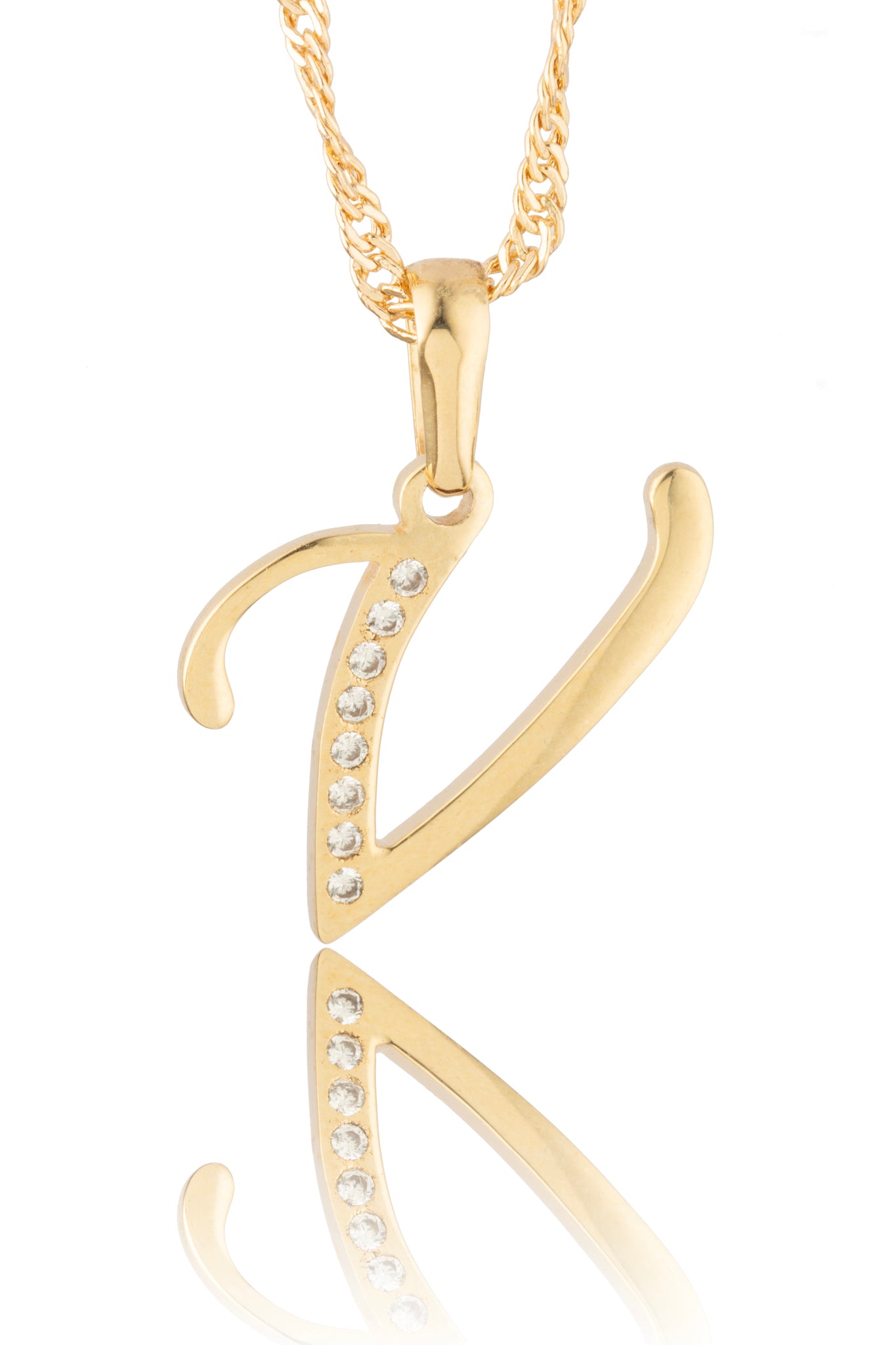 Dije inicial en Oro de 10 kilates con circonitas, 2cm ó 2.5cm de largo incluyendo la rehaza.